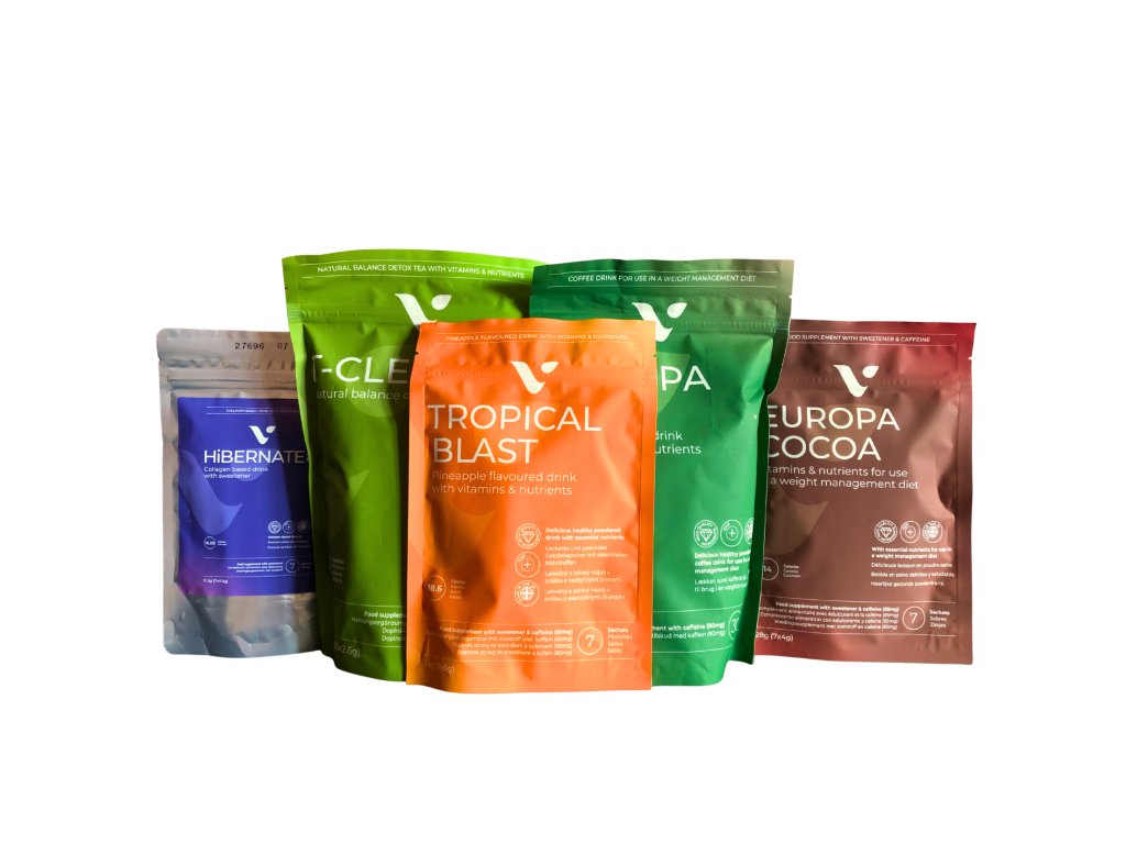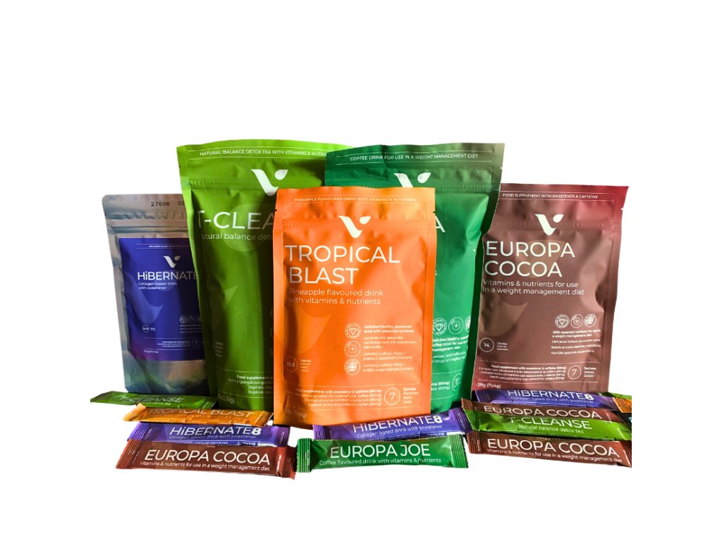 Vyzkoušejte naše jedinečné produkty s balíčkem Valentus MIX 5v1! Tento mix obsahuje vše, co potřebujete – od ranní energie s Europa Joe, přes lahodnou horkou čokoládu Europa Cocoa, až po osvěžující Tropical Blast a čajový nápoj T-cleanse. Nechybí ani večerní relaxační nápoj Hibernate 8. Dopřejte si 5 týdnů plných chuti, zdraví a vitality. Ideální pro objevování nových favoritů!